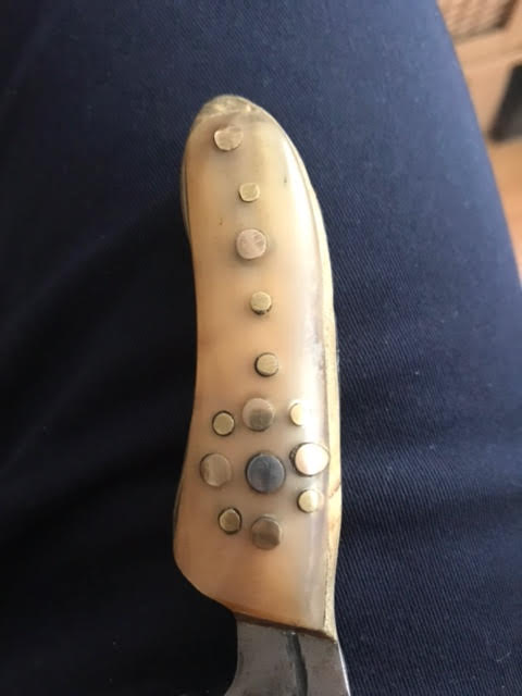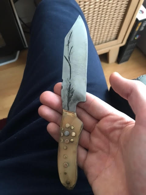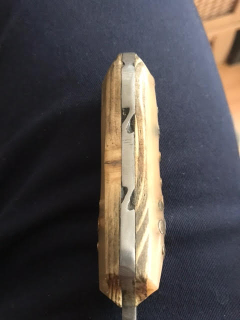 Orné de deux épis de blé sur la lame, son manche est d’un collage en plaquettes de sapin et de corne de vache.